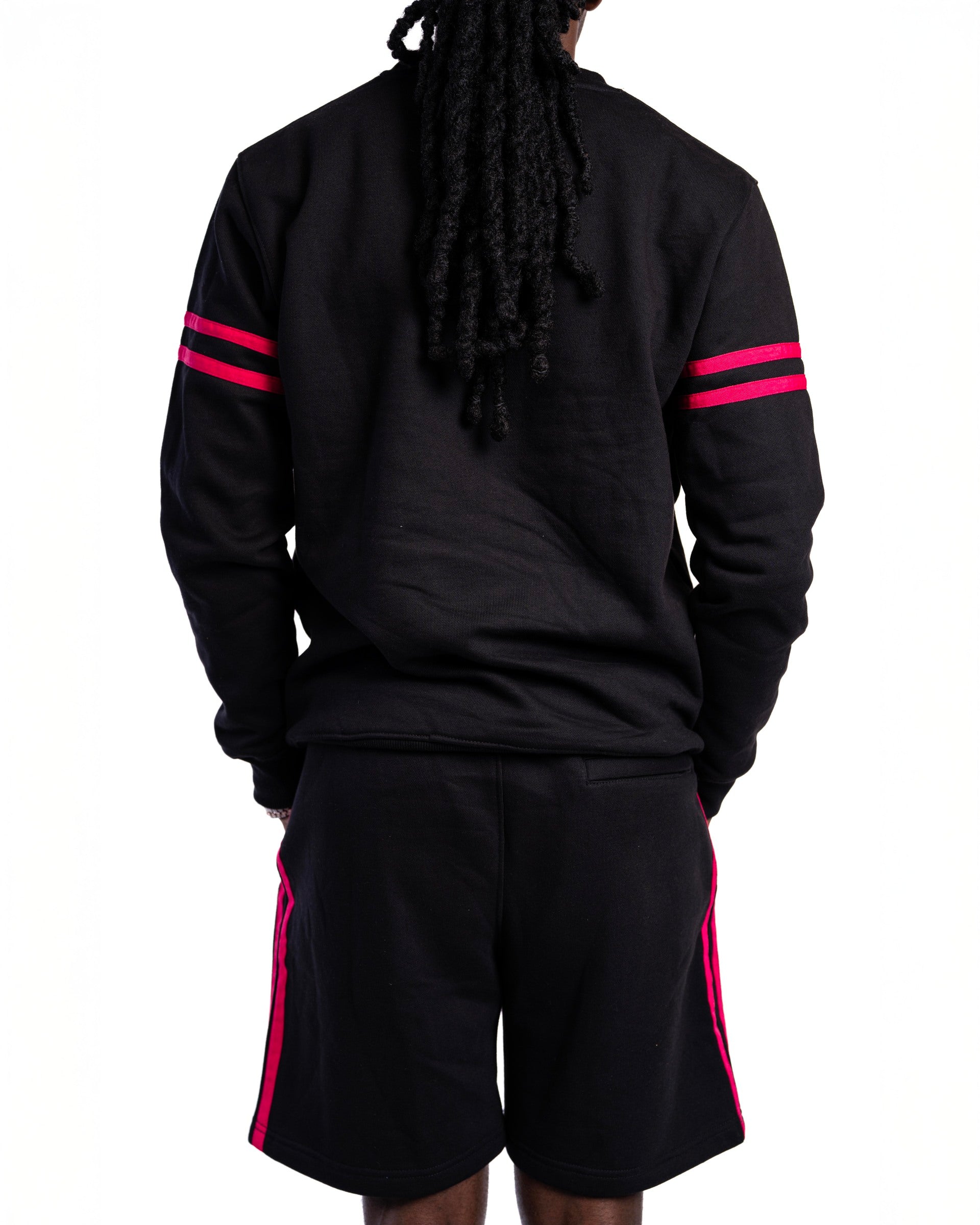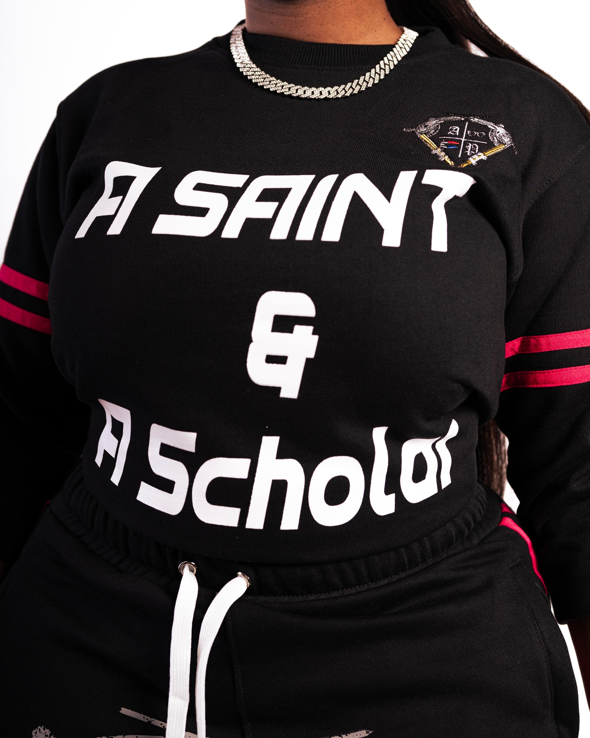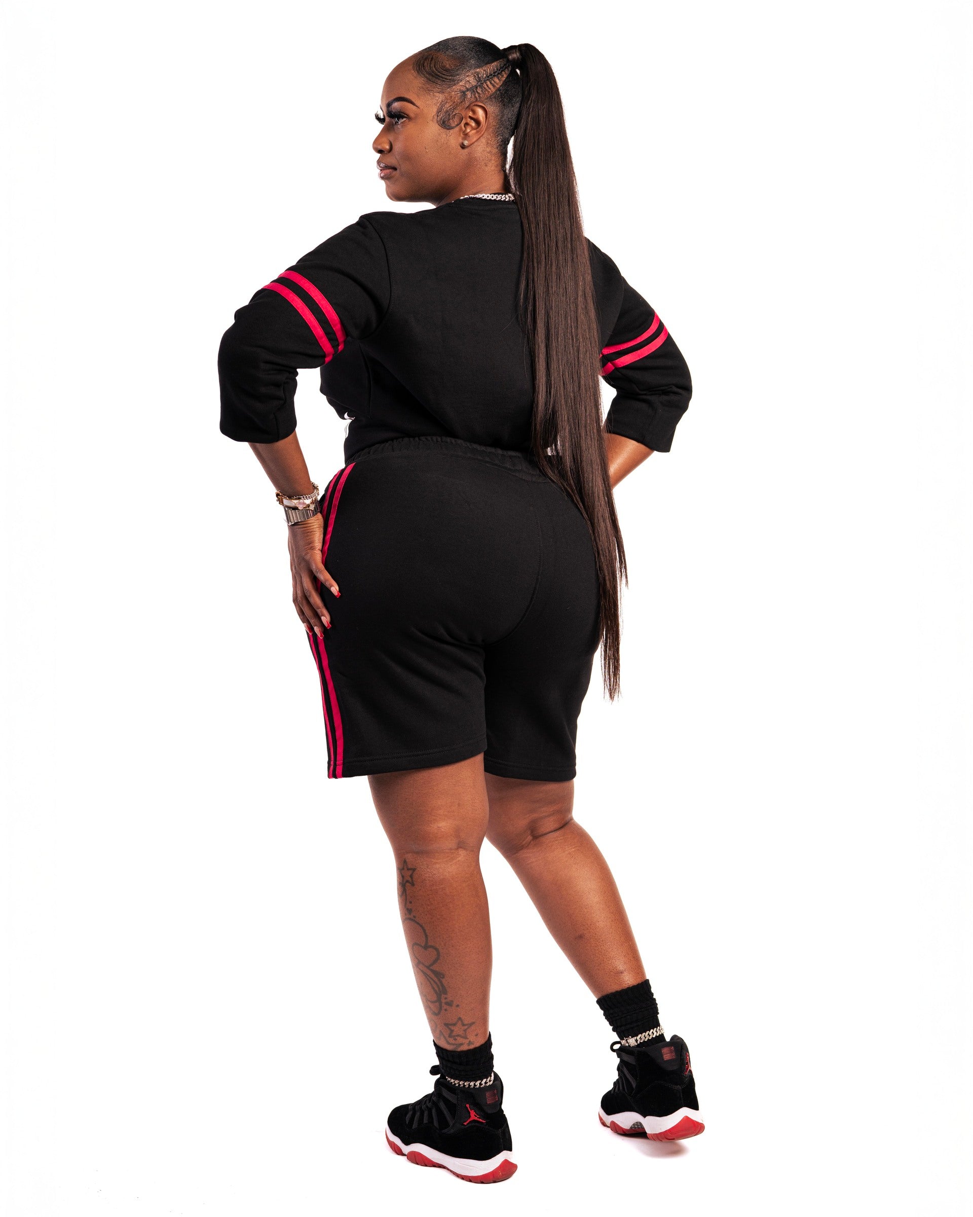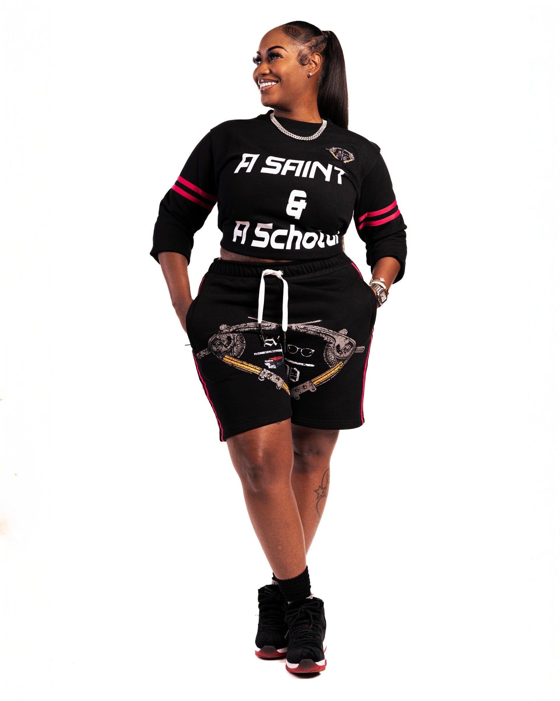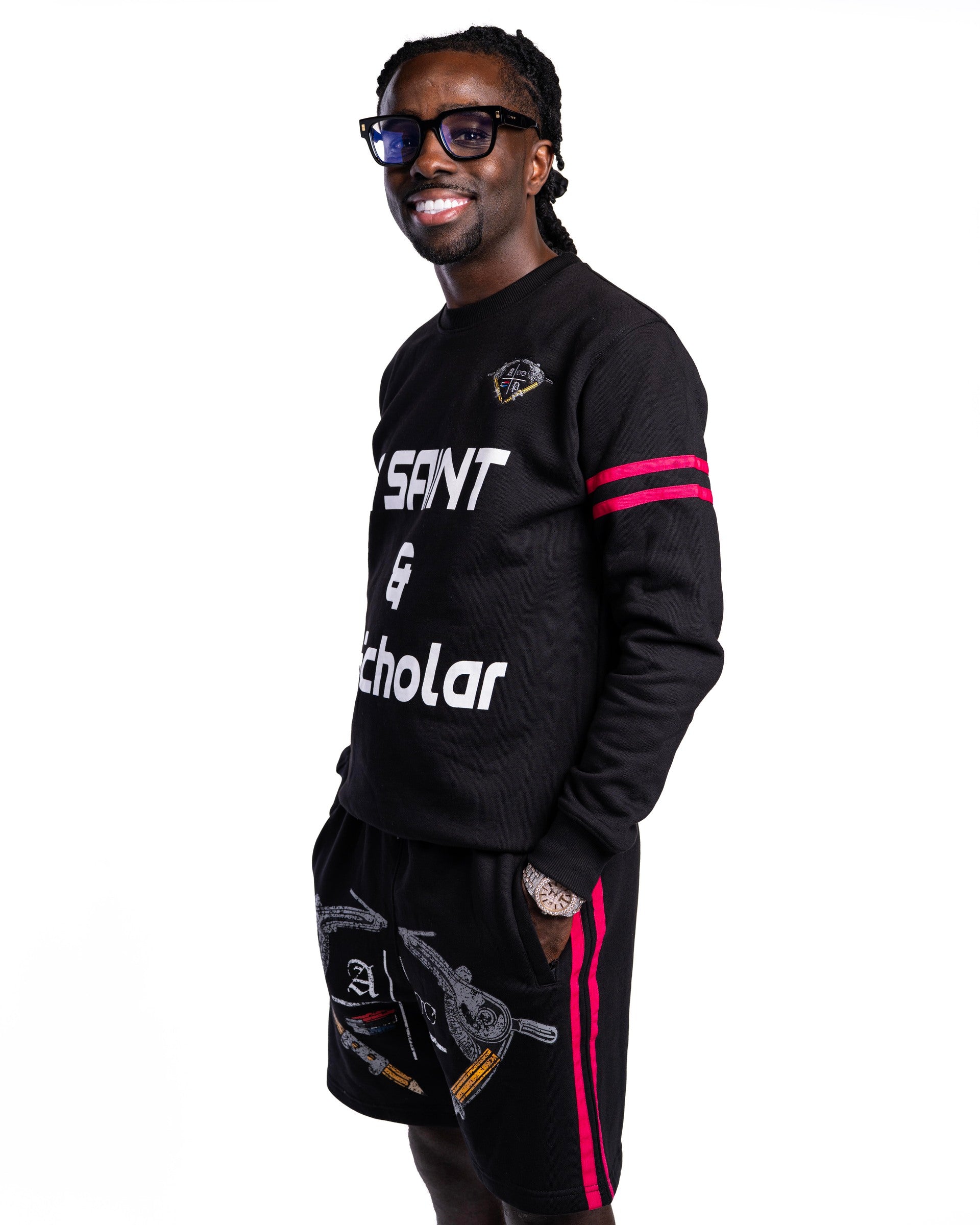 This summery long-sleeved cotton crewneck set, from Summer-Fall 2025 is elevated with a sophisticated saint and scholar patchwork of AP signatures. This buy-now-wear-now piece is the total look. Equipped with drawstring shorts, crafted from soft, organic knitted cotton in elegant black tone that of which has an adorned waistband and large deep pockets. Perfect for traveling or relaxing.