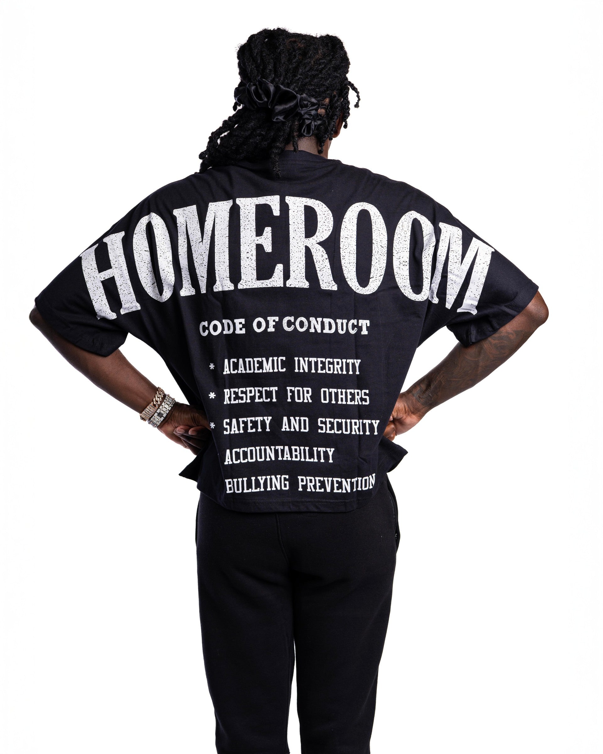 This classic T-shirt stands out with its graphic homeroom signatures. Crafted from black organic cotton, it features pale black screen print lettering across the back, executed with soft woolly stitches.